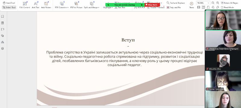 Учасниця Вікторія Пономарьова представила доповідь на тему «Підтримка сімей у складних життєвих обставинах», у якій розкрила сутність і напрями соціальної допомоги родинам, що потребують підтримки, охарактеризувала сучасні технології роботи соціального працівника з такими сім’ями.