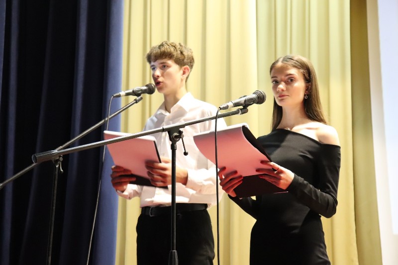Ведучі свята Олександра ВЕРЕМЕЄНКО (студентка групи ОФ-21) та Артем ПЕТРИШИН (студент групи Ат-11) розпочали свято з хвилини мовчання, вшанувавши пам'ять усіх, хто віддав своє життя за свободу та незалежність України.